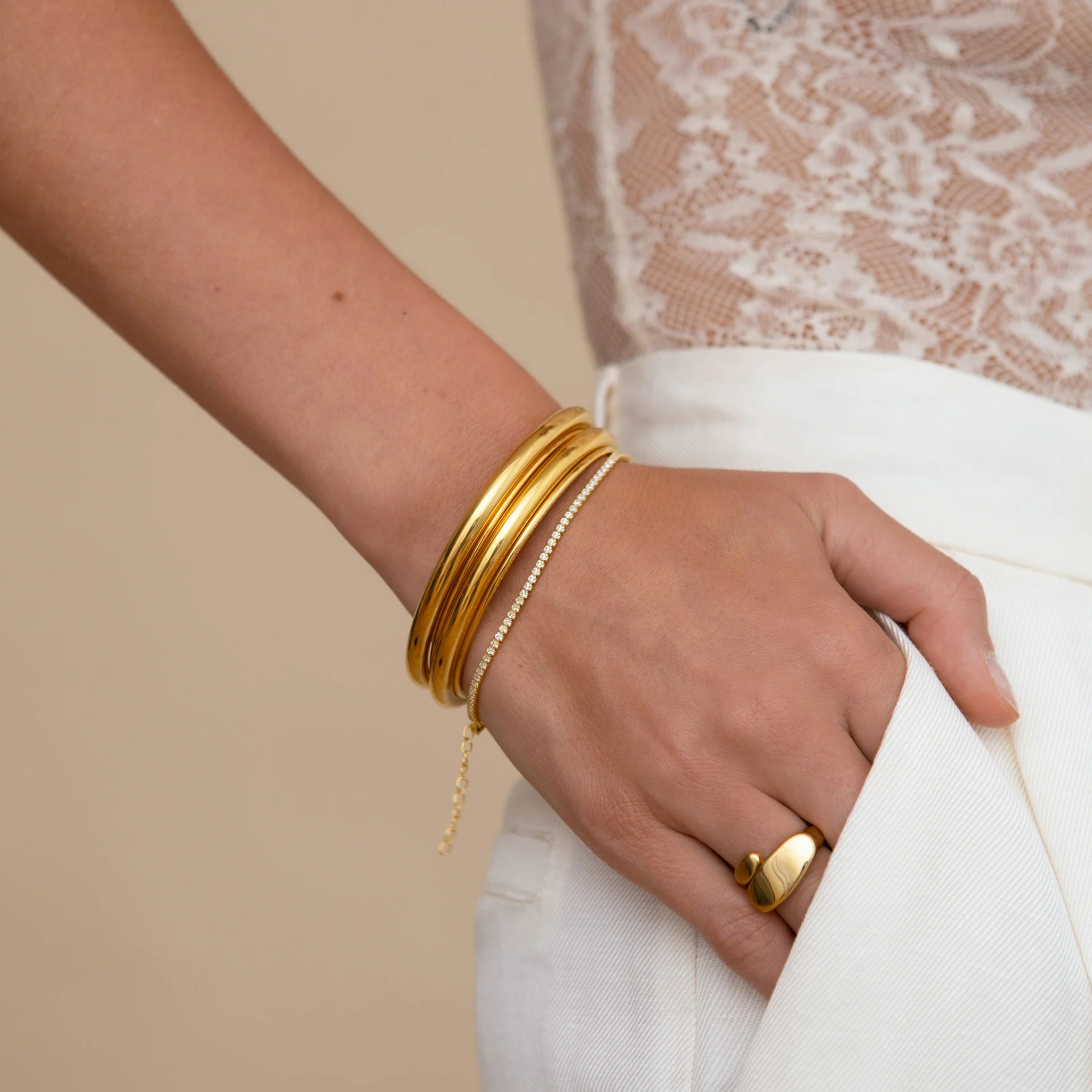 Introduce radiant sparkle to your wrist with the Tennis Gold Bracelet, a timeless piece that elevates any stack. Its delicate brilliance complements bolder, heavier designs beautifully, creating dynamic contrast when layered. A classic that transcends trends, it's the perfect accent to build your signature bracelet combination around.