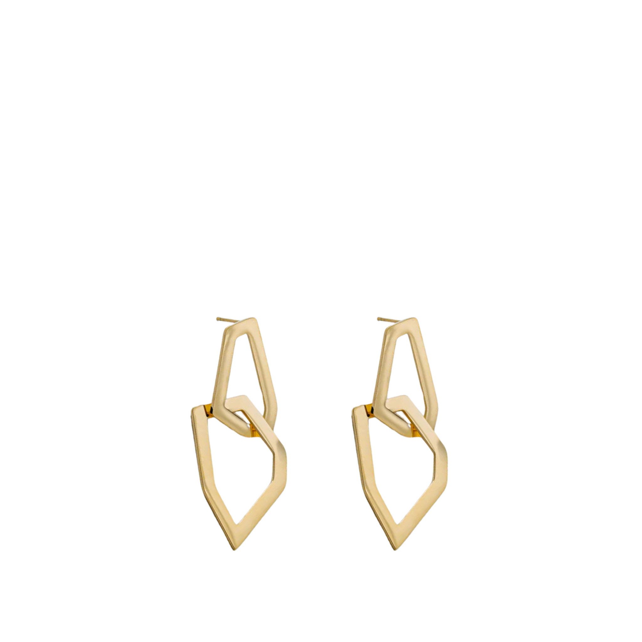 Geometric inter-locked earrings with double the dimension — serving the drama from the front + side.