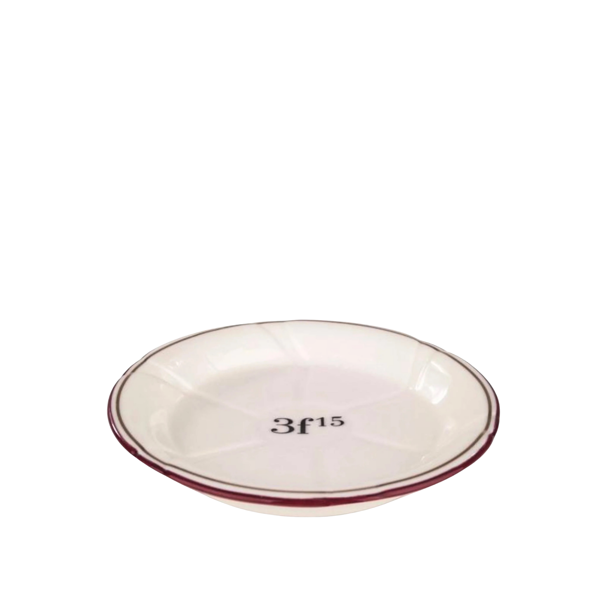This saucer has a hand-painted red rim with pinwheel lines accented in red and gold. The mark of the franc is printed on the bottom of the saucer.