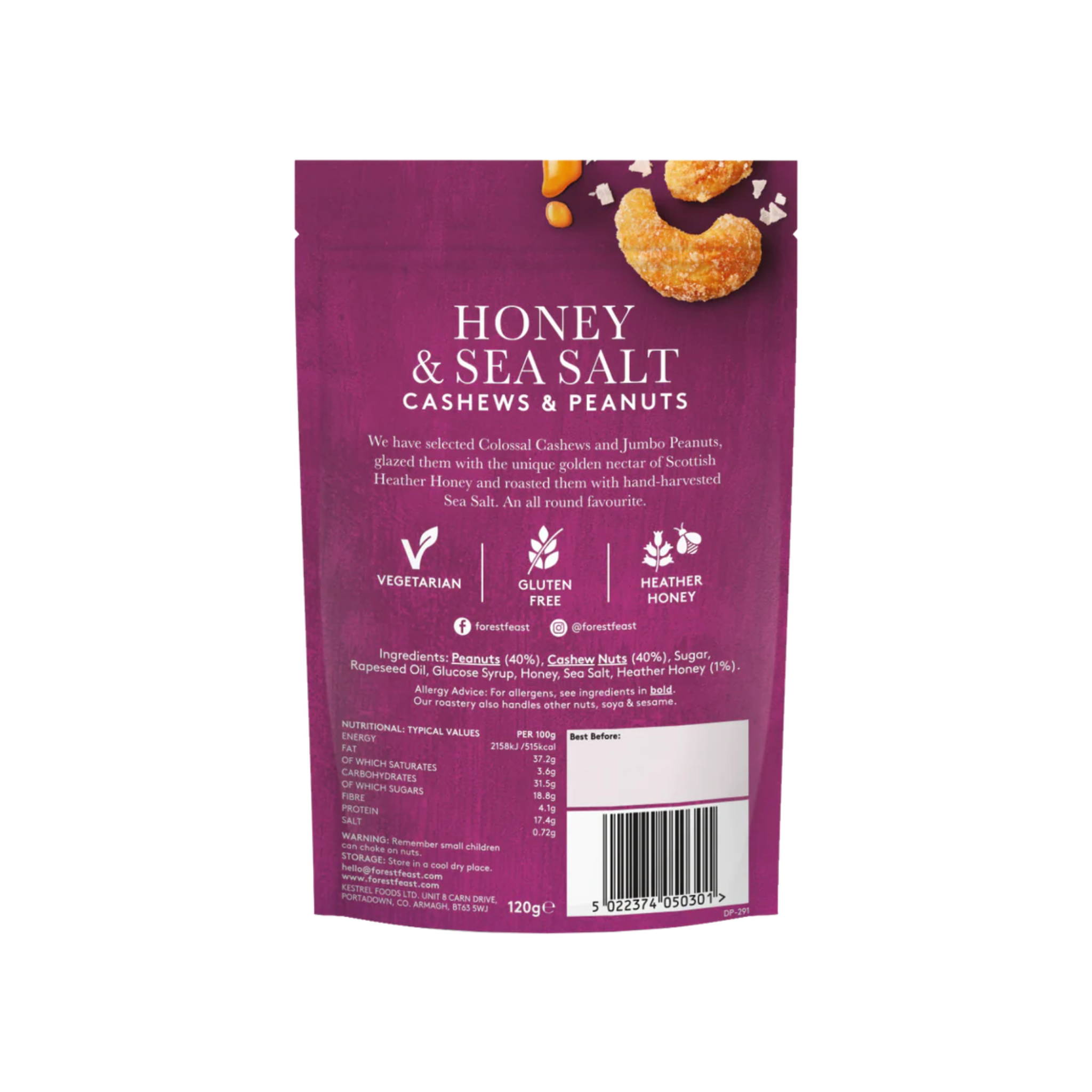 Colossal Cashews and Jumbo Peanuts glazed with the unique golden nectar of Scottish Heather Honey and roasted with hand-harvested Sea Salt. A truly distinctive blend that brings together premium nuts with the delicate floral notes of heather honey, finished with a touch of natural sea salt. An all-round favourite for those seeking something special.