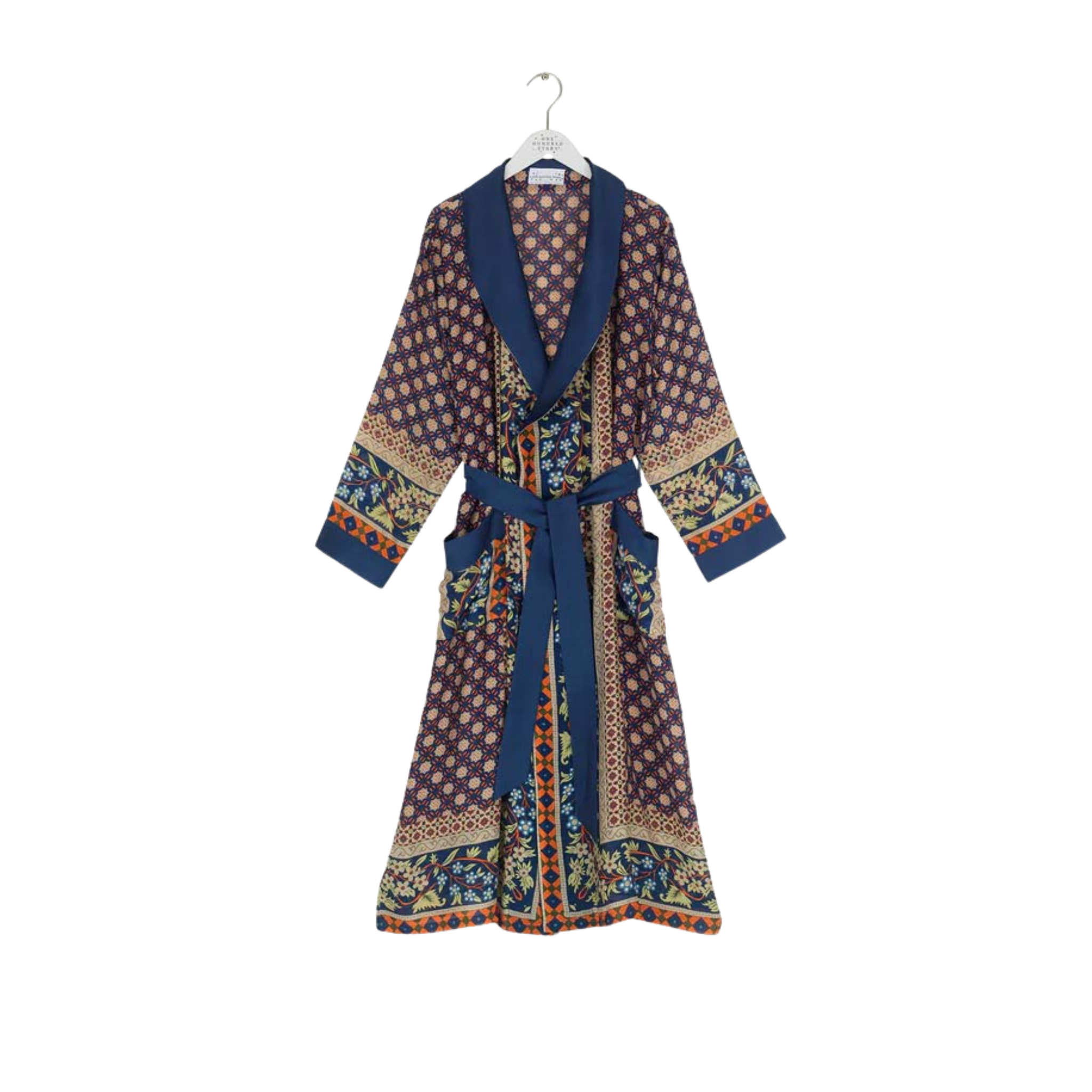 This gown showcases intricate geometric patterns inspired by Moorish art. Crafted from a sustainable blend of modal and cupro, it offers a silky, lightweight feel. The design features a fold-over collar, self-tie waist belt, and front patch pockets, falling gracefully to a long length. Ideal as a refined house coat or a stylish layering piece, it fits most UK sizes 8-18 with precise measurements for comfort. Fabric care requires washing at 40°C and cool ironing.