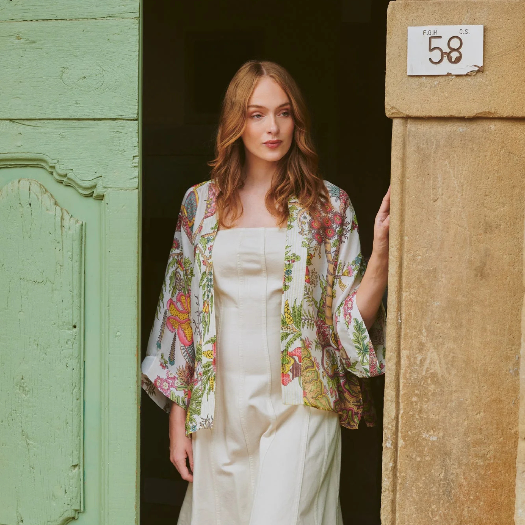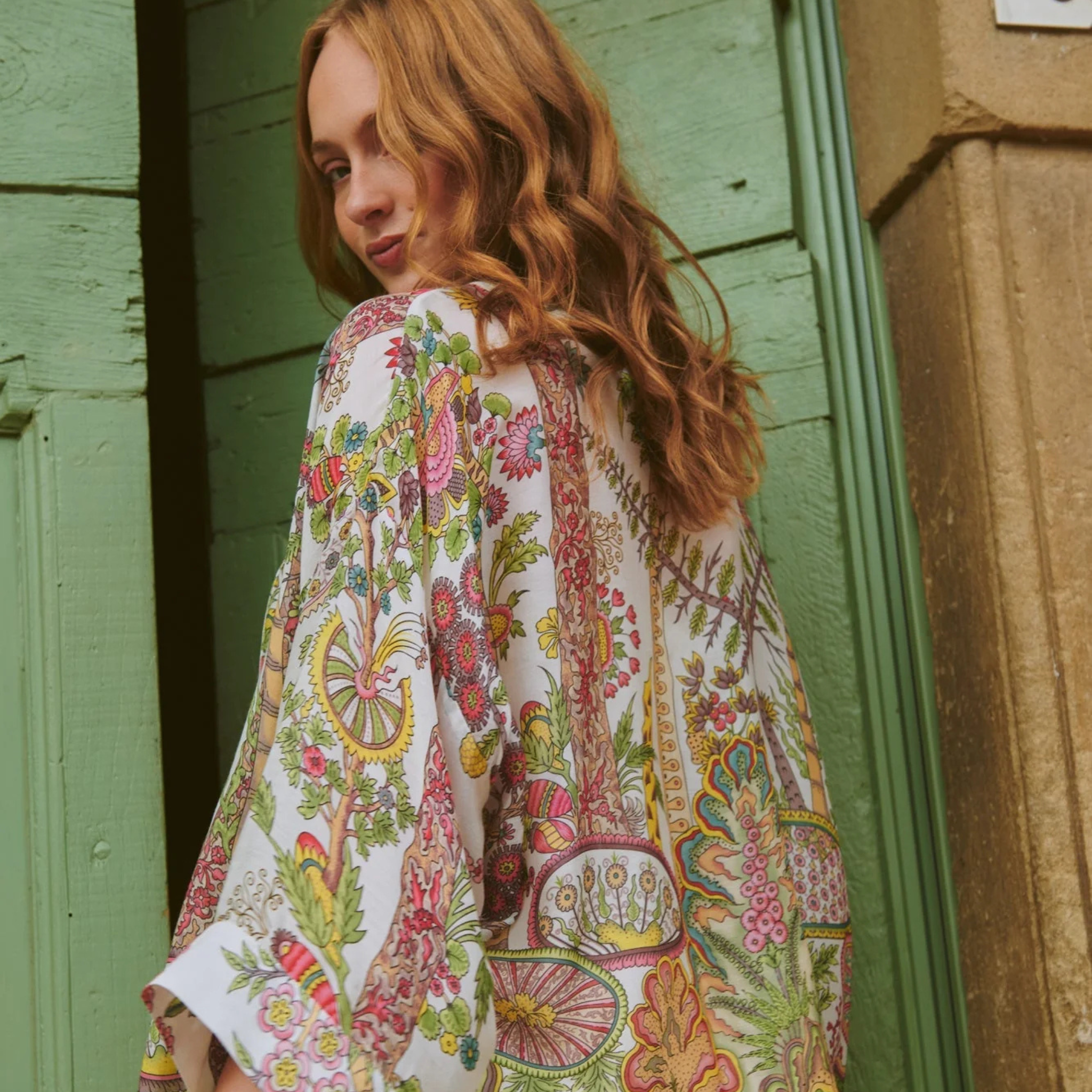 An enchanting botanical escape awaits in this kimono jacket. Vivid lime, pink, blue and lilac blooms burst against a serene ecru backdrop, capturing the essence of an imaginary garden. Featuring signature loose ¾ sleeves, an open front and embroidered lapel detail, it pairs beautifully with a matching camisole and jeans for summer, or layers elegantly over a polo neck when seasons change.