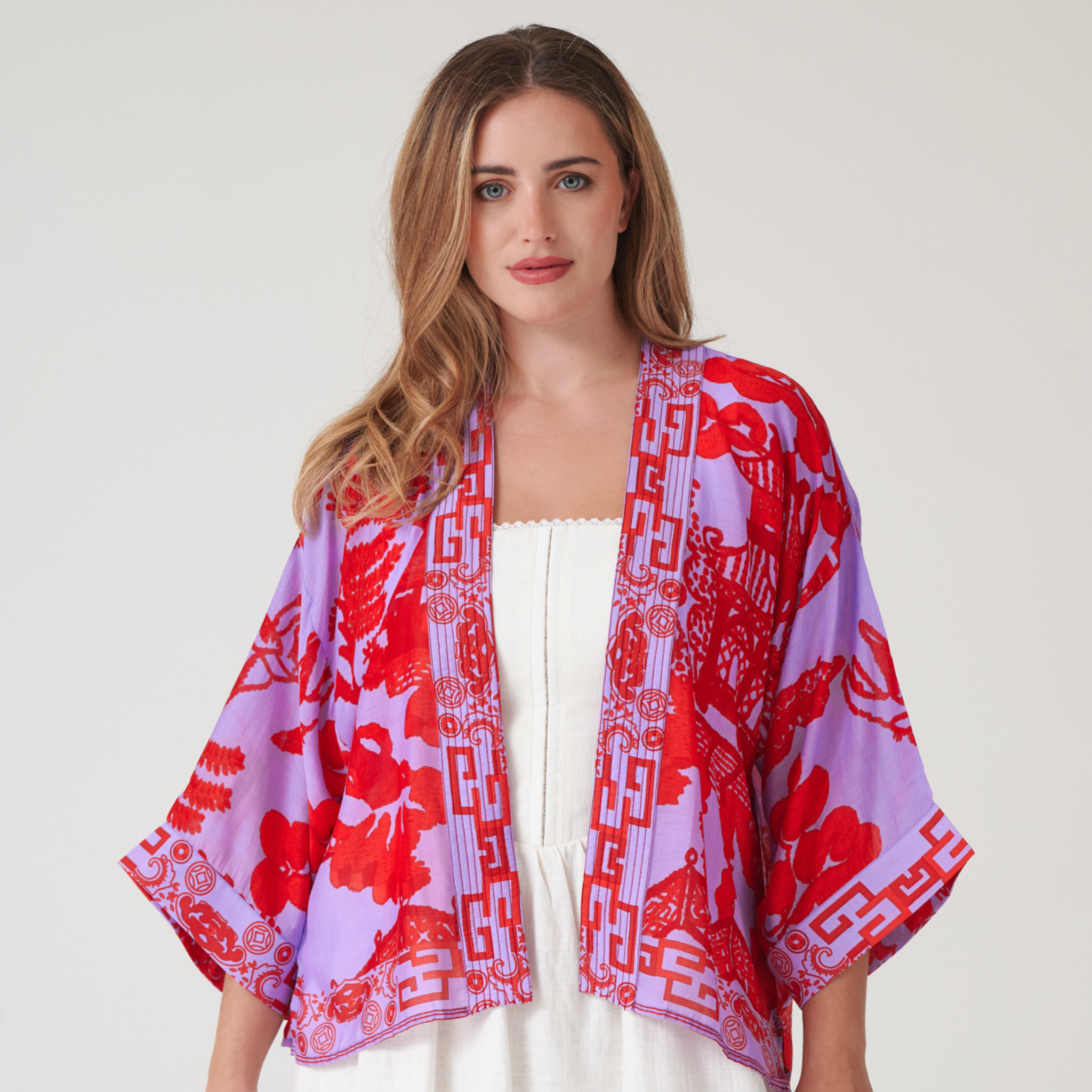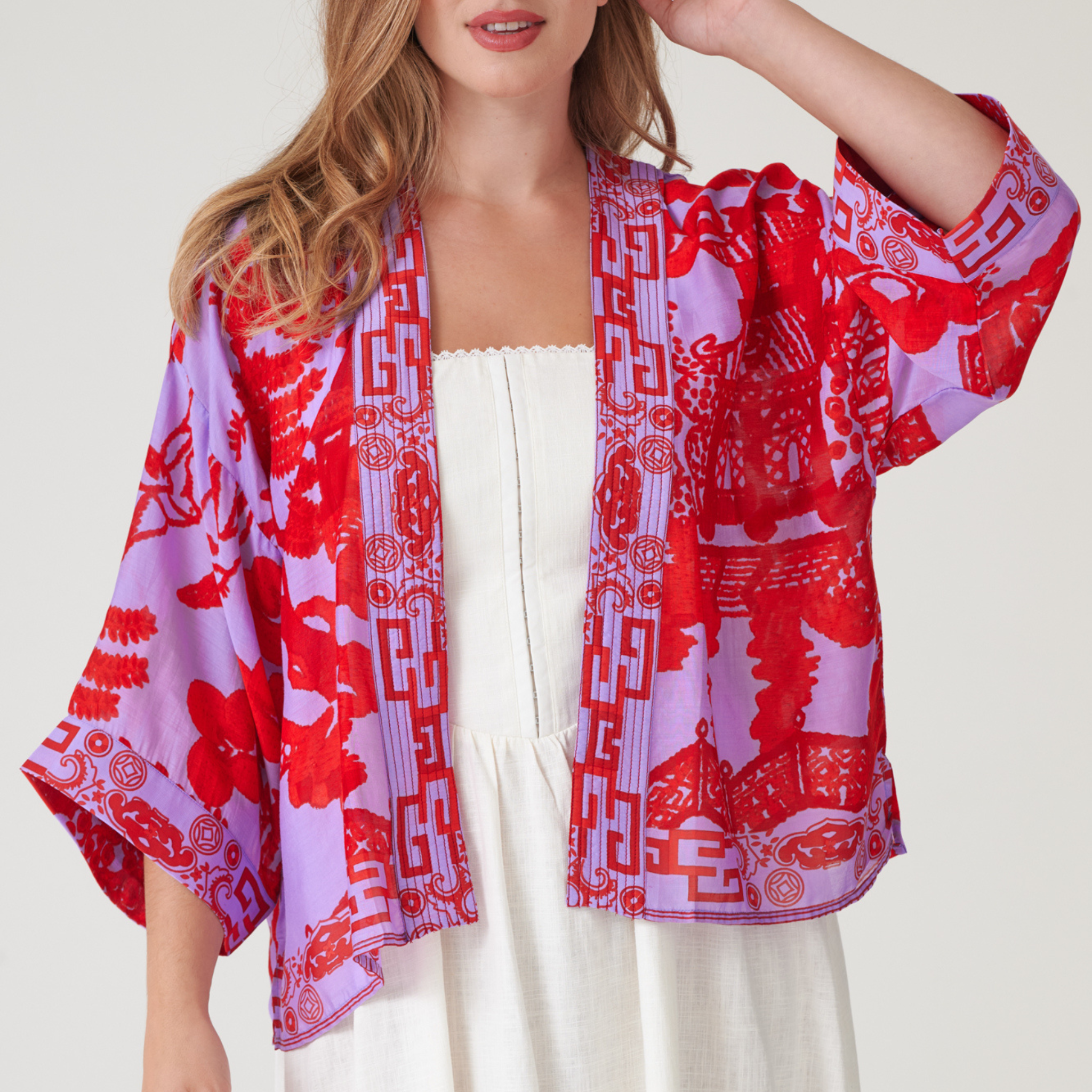 This Giant Willow Violet kimono captures the essence of vintage elegance with its striking red willow design on a rich violet canvas—a pattern traditionally seen on fine pottery. Woven from a thoughtfully sourced modal and viscose blend, it delivers a luxuriously soft, weightless feel with minimal environmental impact. The jacket's defining features include generously cut ¾-length sleeves, an unstructured open front, and delicately embroidered lapels. Style it with a coordinating camisole and denim for summer sophistication, or layer over a fitted turtleneck as temperatures cool.