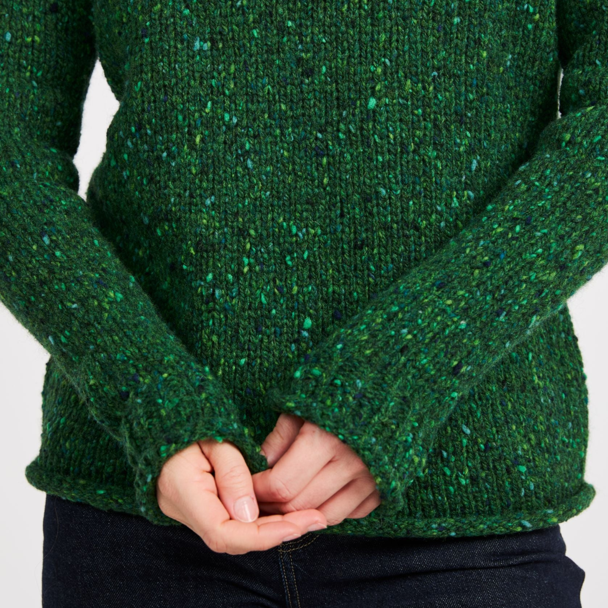 The Ladies Roll Neck Raglan in Green offers a refined and comfortable fit, crafted from 100% Donegal tweed. This piece blends traditional Aran craftsmanship with contemporary design, resulting in a timeless texture and elegant silhouette. Perfect for those seeking understated sophistication in a versatile colourway.