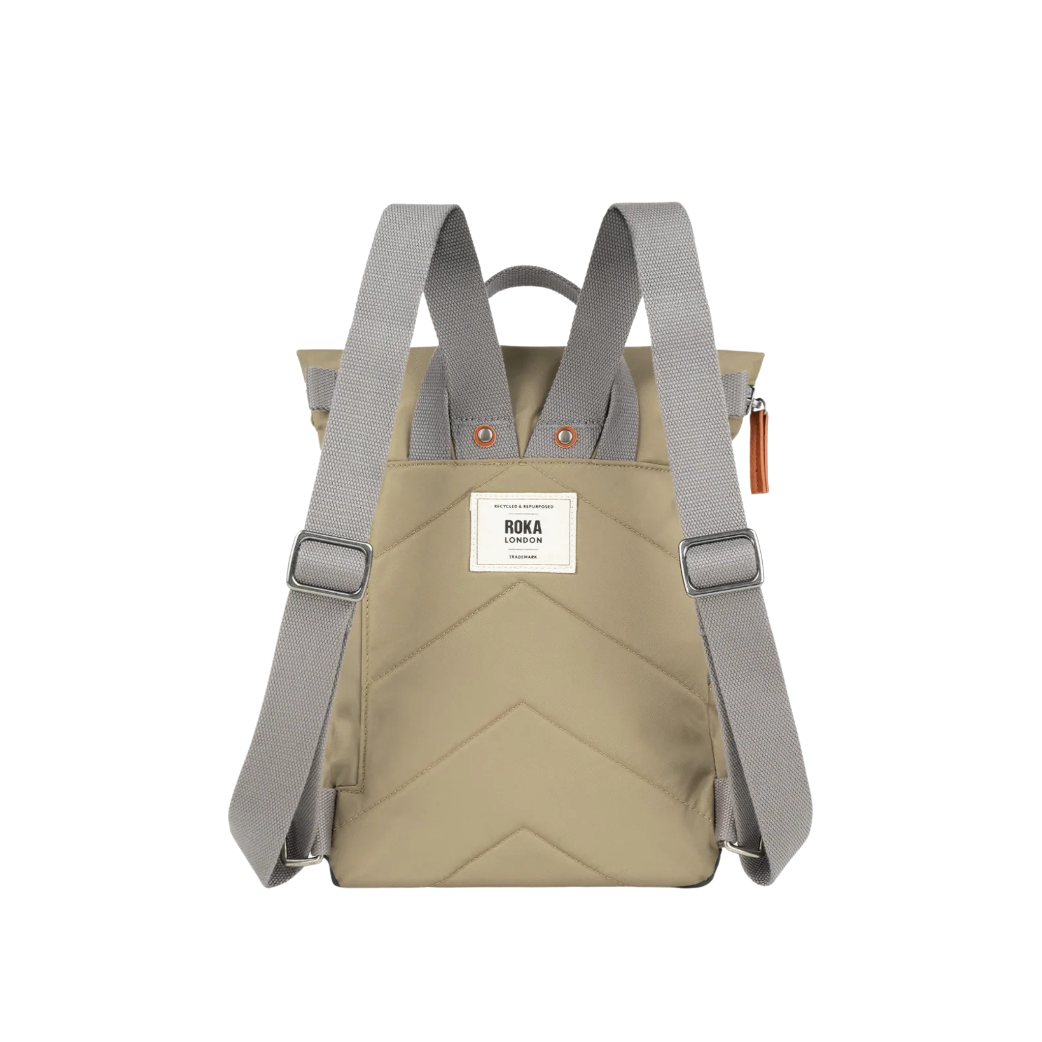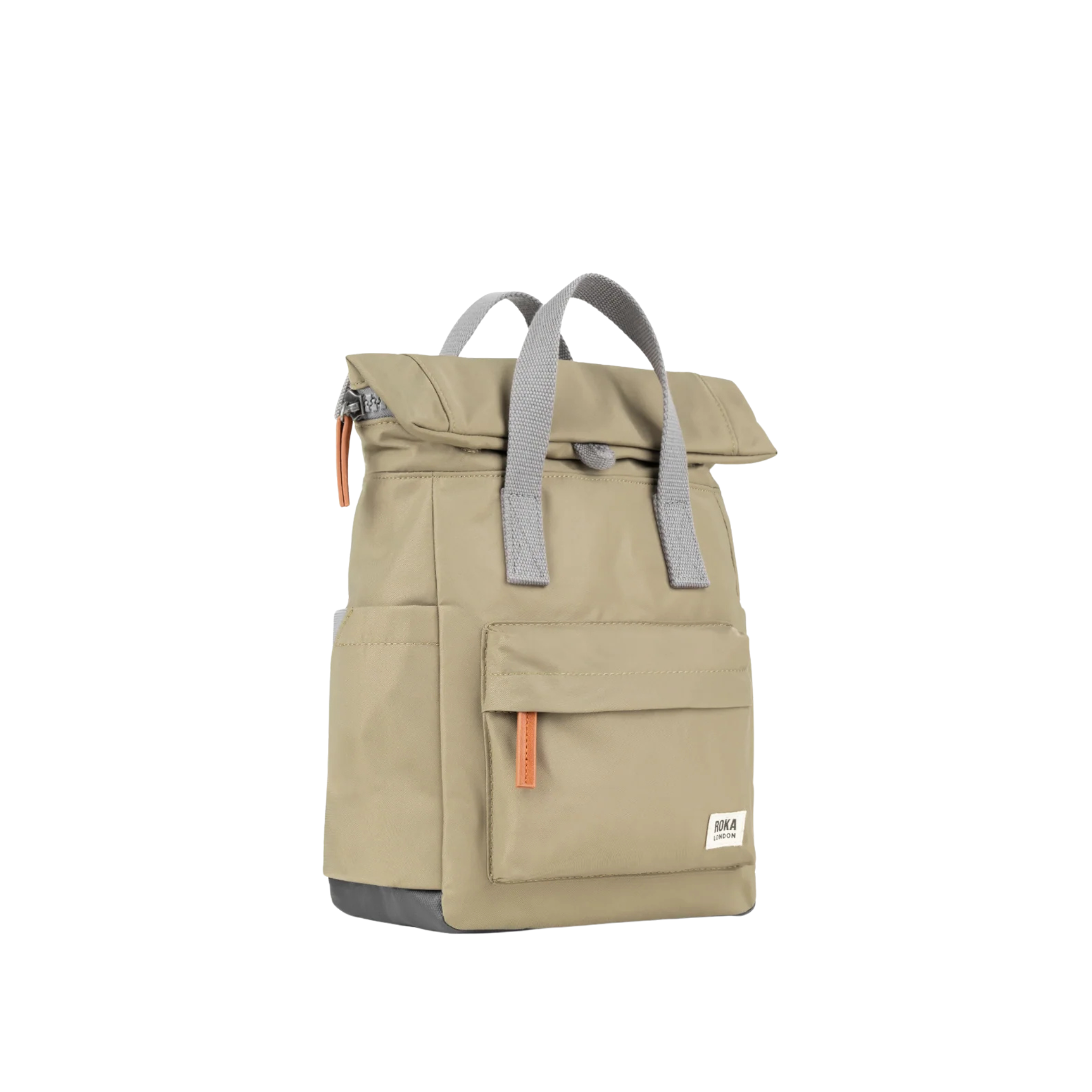 Introducing the Roka London Canfield B Taupe Small, the ultimate travel companion for any journey. Its roll-top design allows for easy access and the chunky zip, magnetic holders, and secret pocket ensure security. With additional pockets for tech and side bottle holders, this bag is both stylish and practical.