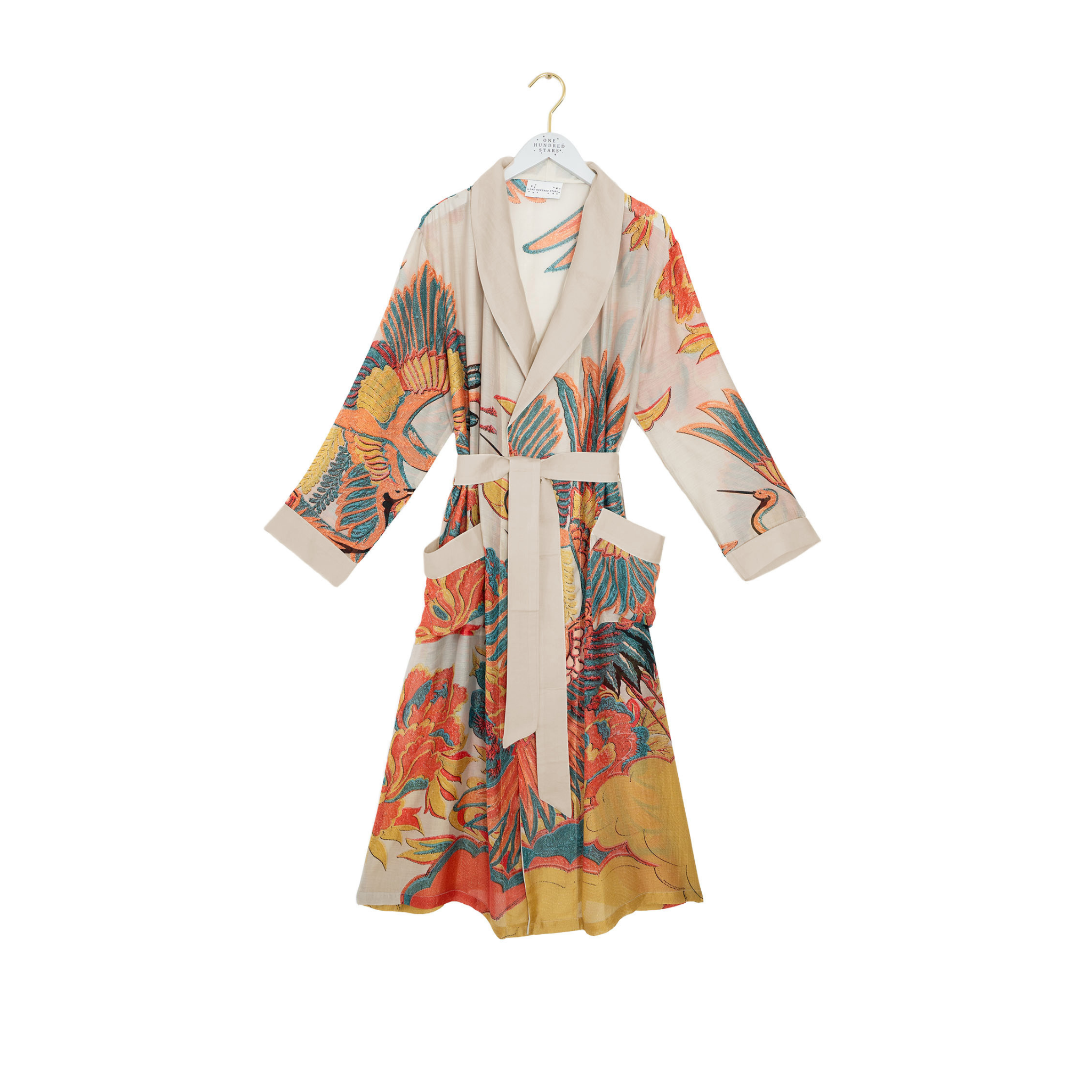 Celebrate the crane—an enduring emblem of happiness and good fortune. This exquisite gown features a bold, meticulously curated palette of jade, cobalt, and terracotta that brings the graceful bird to life against a tranquil stone canvas, designed to delight and inspire. The lightweight design falls to an elegant long length and features a fold-over collar, complete with a self-tie waist belt and front patch pockets. A distinguished addition to any wardrobe that seamlessly transitions from intimate comfort to refined sophistication.