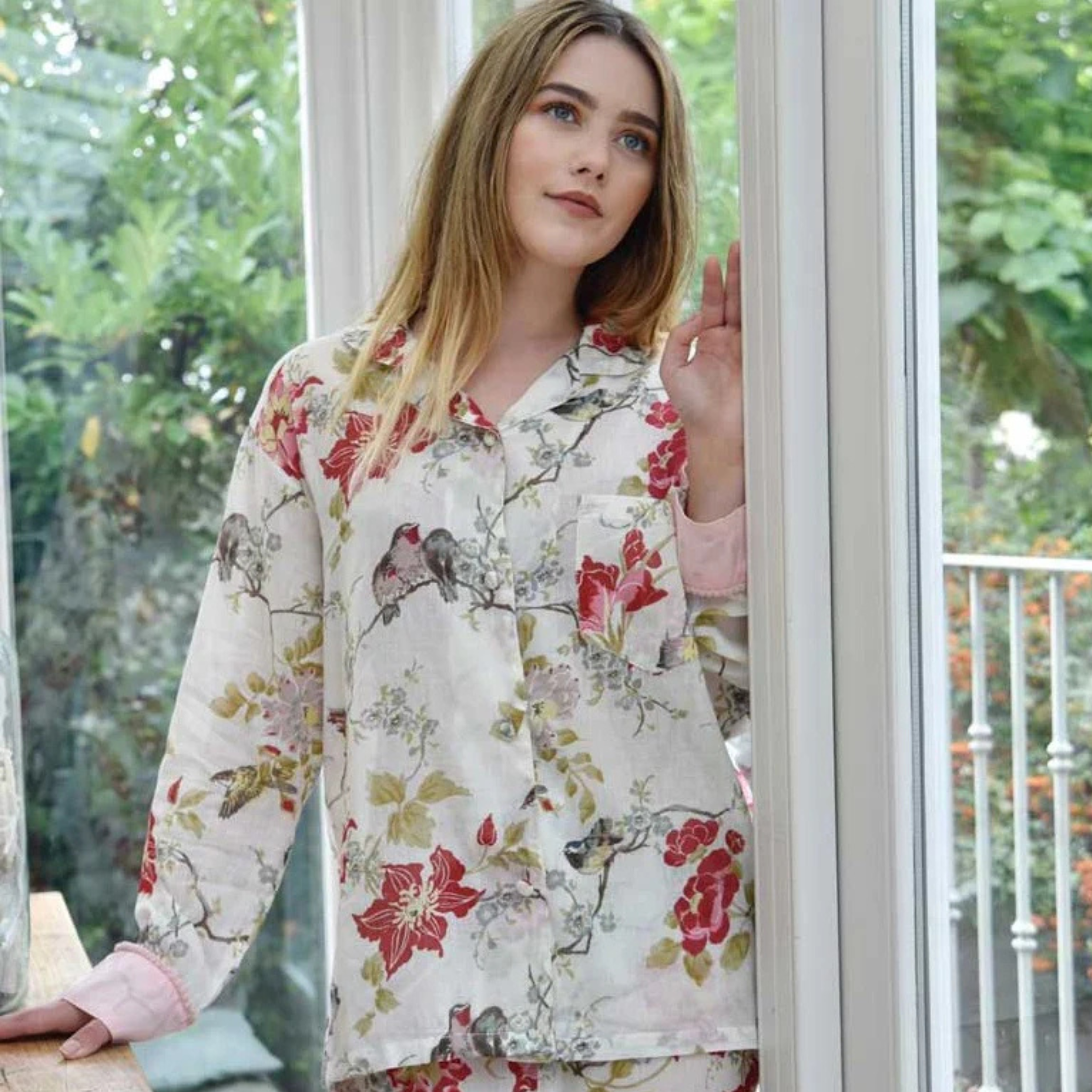 Crafted from sumptuous cotton, these printed pyjamas are wonderfully light to wear, effortless to care for, and ideal for weekend lounging or travel. A timeless choice for personal indulgence or as a thoughtful gift. The design features an elegant composition of colourful birds perched on grey branches adorned with deep red roses in full bloom, accented with soft green foliage against a crisp white background. Contrasting pink cotton trims the jacket cuffs and trouser hems, finished with delicate pom pom detailing. The pyjama jacket fastens with fabric-covered buttons and includes a single breast pocket, whilst the trousers feature a drawstring waist for adjustable comfort.