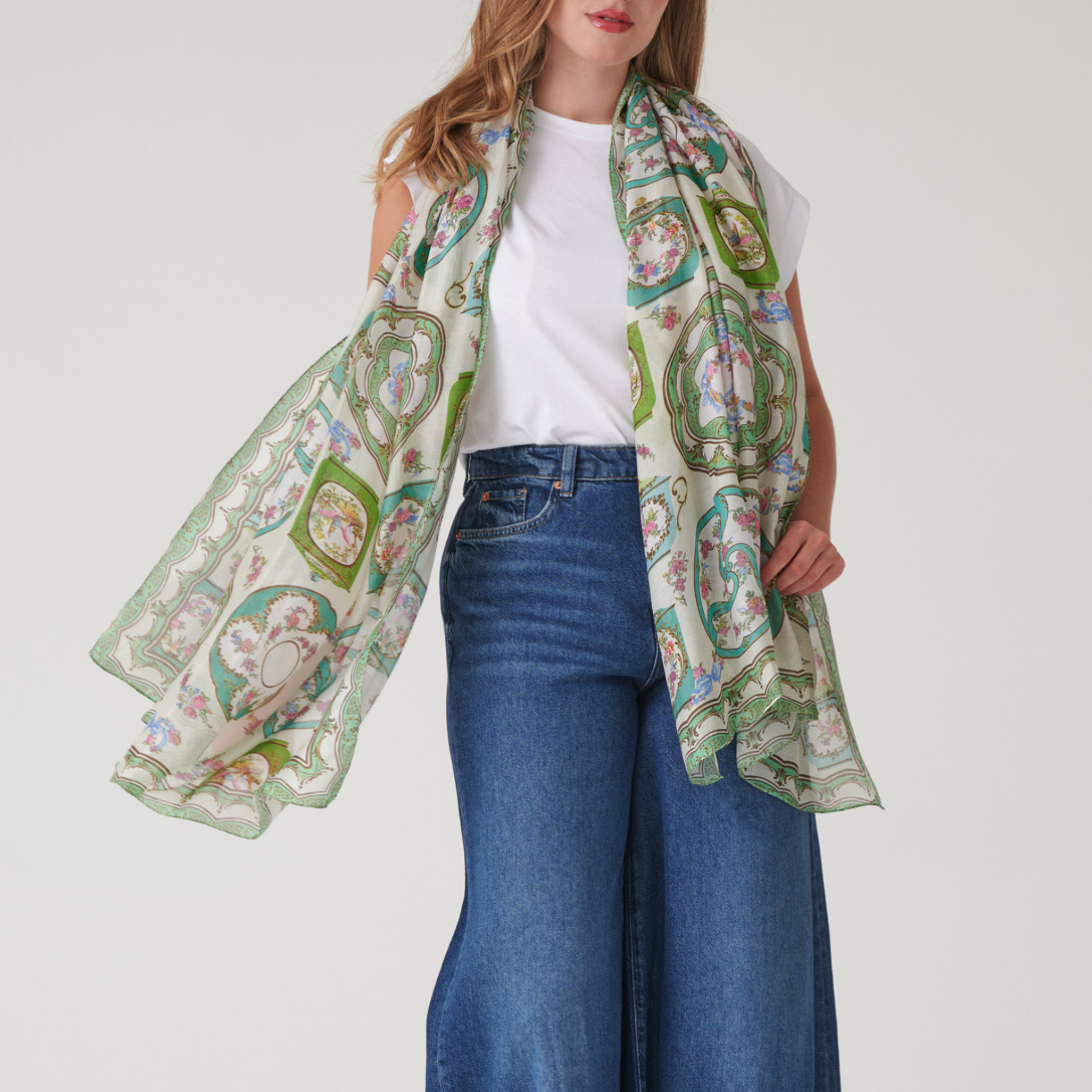 A sophisticated tribute to the genteel tradition of English afternoon tea, this scarf showcases an enchantingly eccentric print of fine porcelain—graceful cups, saucers, and plates in turquoise, green, and soft yellow hues. At 100cm x 200cm, it's generously proportioned for year-round wear: bundle it for winter layering or wear it as a refined summer drape. An elegant accessory that honours timeless heritage with artistic flair.