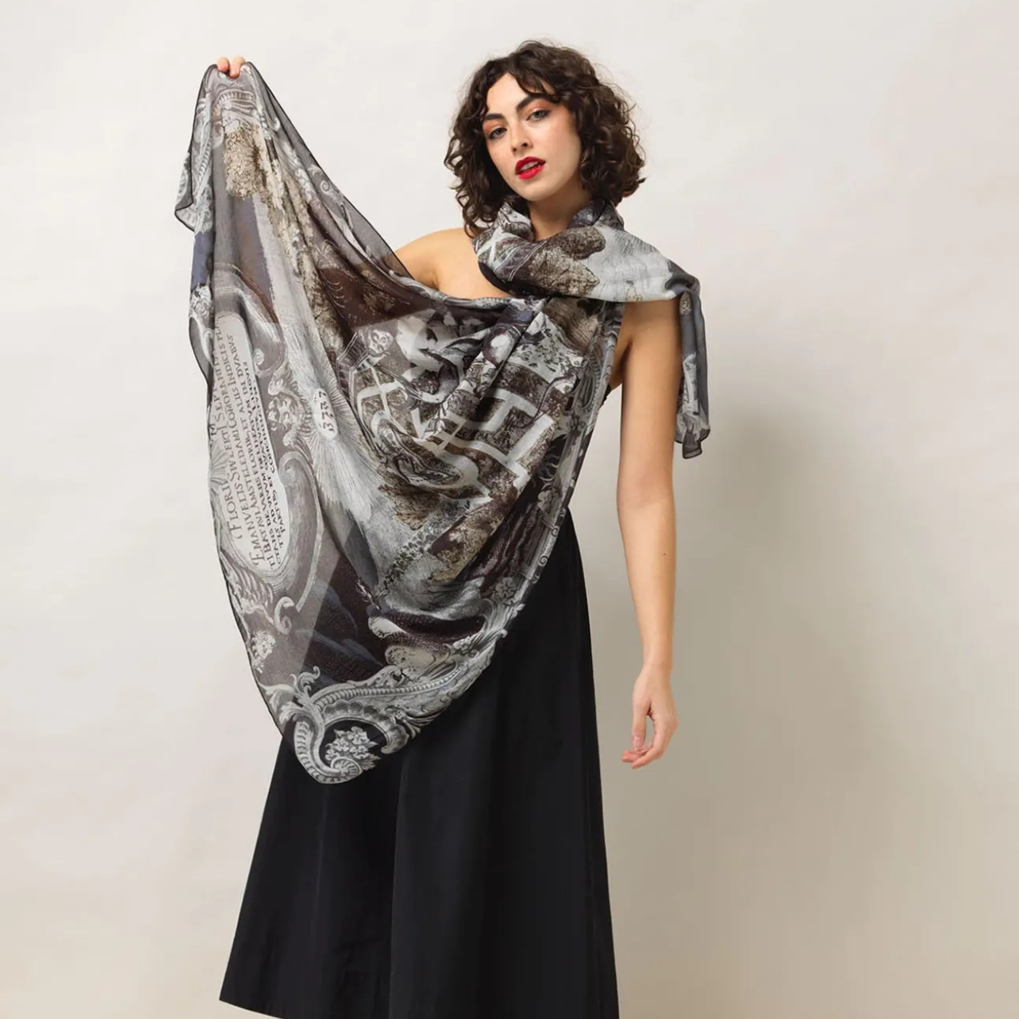 Discover architectural elegance with this striking scarf, inspired by the grandeur of Versailles and the opulence of Louis XIV's reign. The Sunburst design captures ornamental gardens and sculptural details in a carefully curated palette of black, grey, and muted green - offering a contemporary edge to your autumn and winter collection. Perfect for those seeking sophistication with an understated sense of drama, this piece seamlessly transitions from day to evening wear.