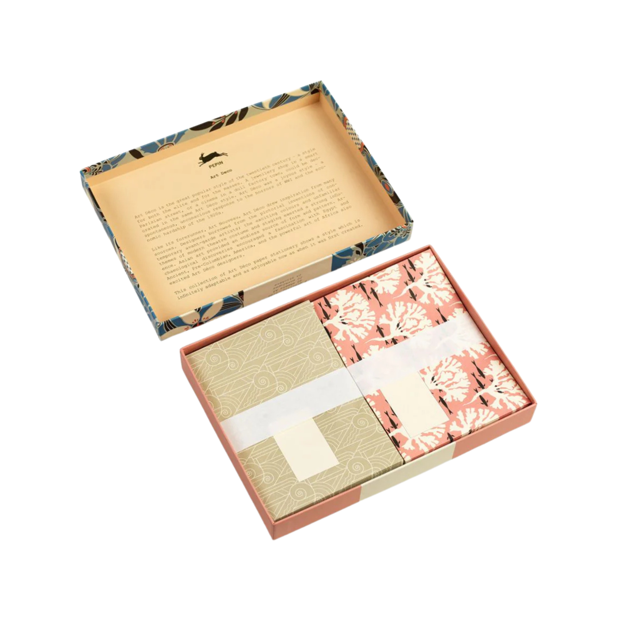 Each box contains 10 sheets of 4 different designs (printed on one side), making up 40 sheets of A5 writing paper (150 x  210mm / 6” x 8¼”). Included are 20 matching envelopes (10 x 2 designs), 8 greeting cards (2 x 4  designs) and 25 assorted stickers and labels.
