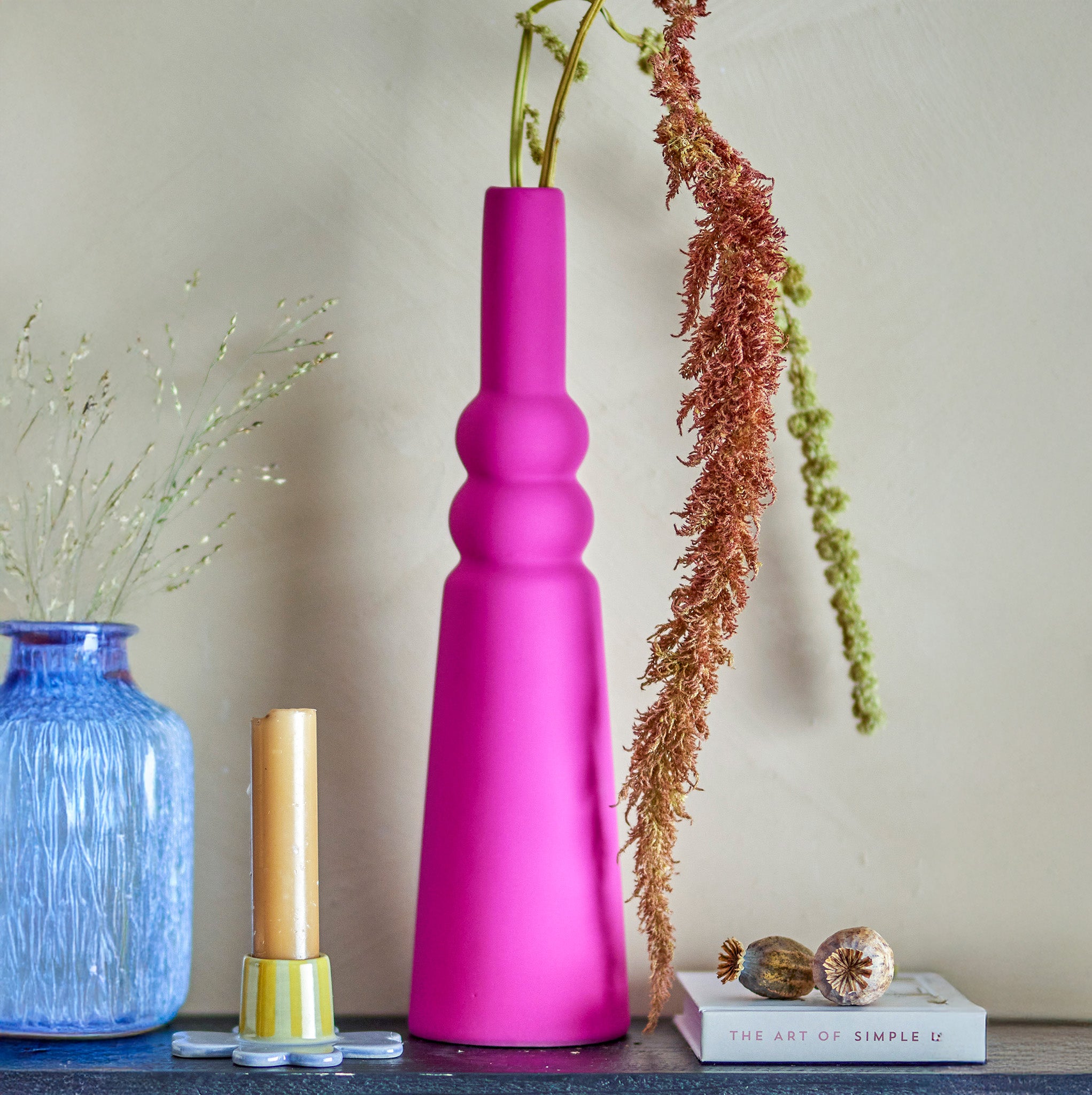 The Isolde Vase by Bloomingville is a tall, slender vase with a very special pink glaze that feels like rubber. The narrow opening makes it perfect for placing a single long-stemmed flower or plant for an elegant look.