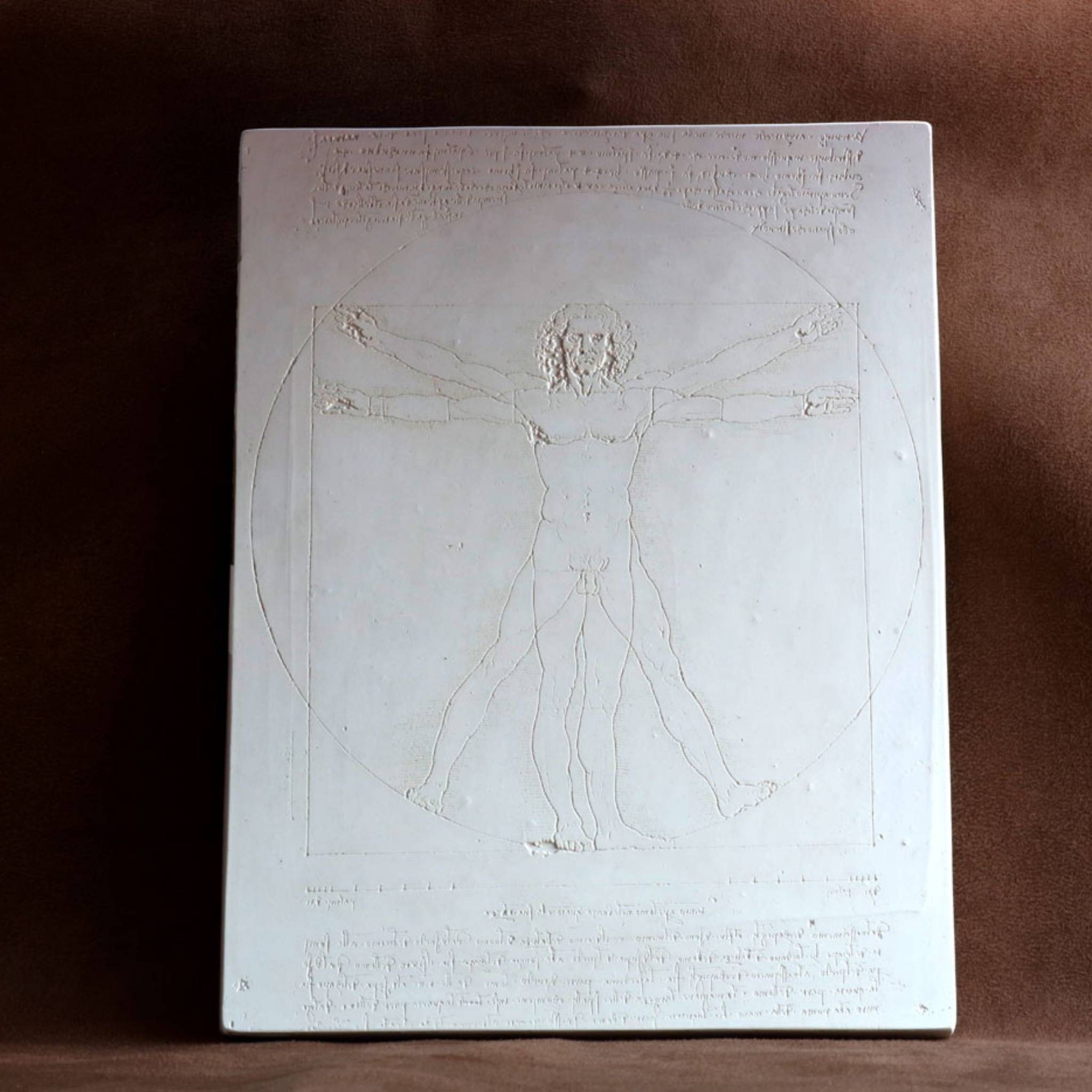 The drawing is based on the correlations of ideal human proportions with geometry described by the ancient Roman architect Vitruvius in Book III of his treatise De Arcitectura.